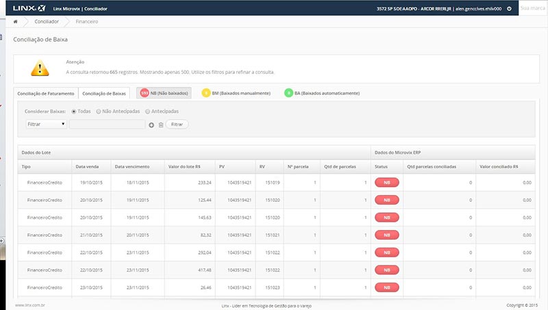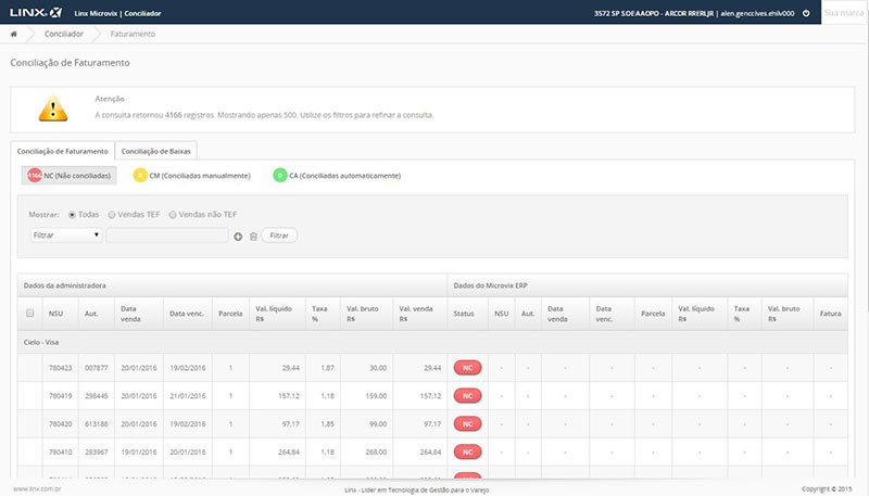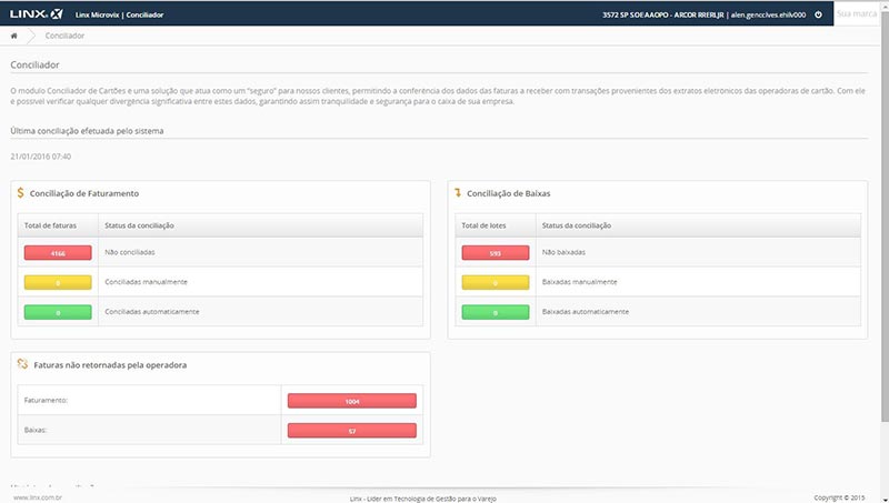 O Linx Microvix Conciliador oferece aos lojistas um canal único para visualização de informações pertinentes às vendas realizadas com cartão de crédito e débito, facilitando o processo de conciliação das faturas a receber das administradoras de cartões geradas pelo ERP com as transações eletrônicas provenientes de vendas com soluções TEF (Transferência Eletrônica de Fundos).